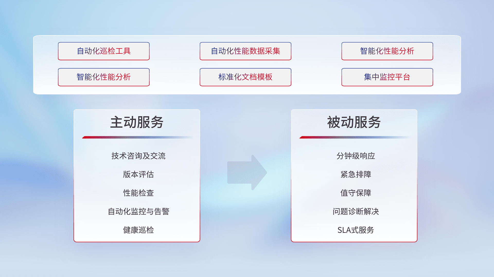 智能化工具和标准化文档,,保障服务质量,,,提供主动服务(包含技术咨询、、、版本评估、、、、性能检查、、、自动化监控与告警、、健康巡检)和被动服务包含(分钟级响应、、、、紧急排障、、值守保障、、、问题诊断解决、、、、SLA服务)。。。。
